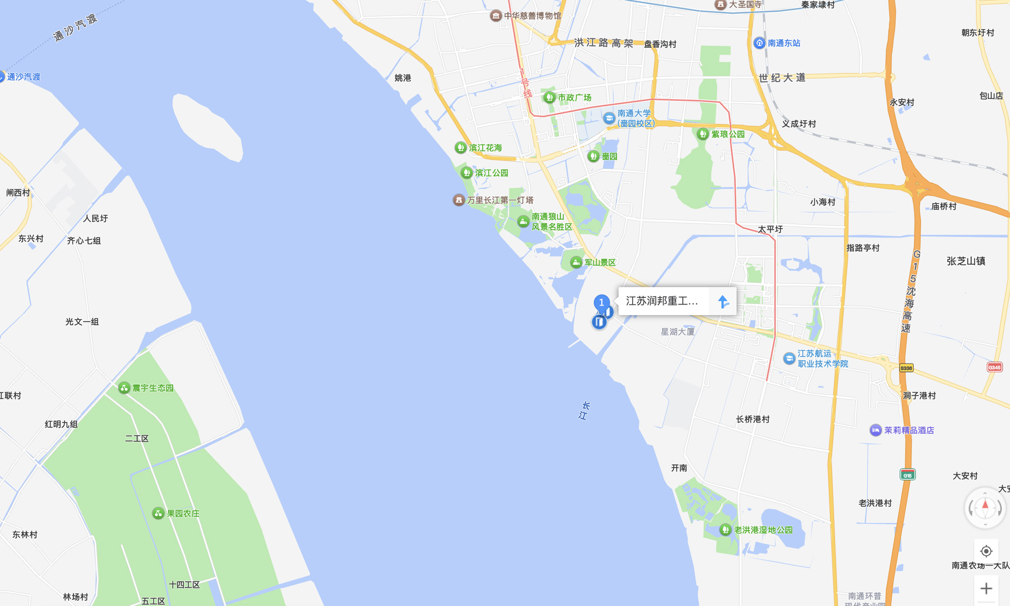 路線1:蘇通大橋→沿海高速→沿江高速(南京方向)→南通城區出口→通寧大道→城北大道→長泰路→榮盛路
